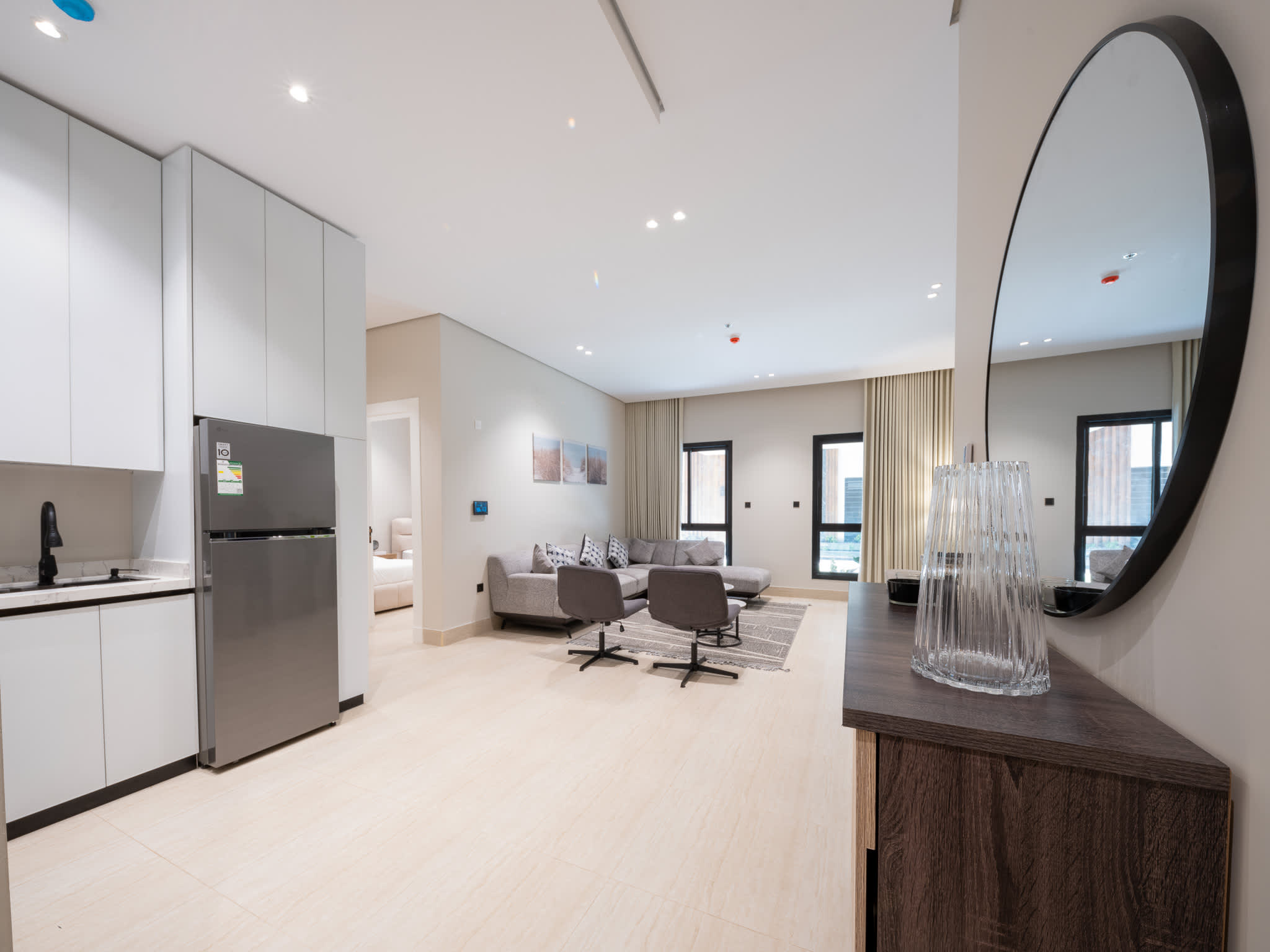 تتكون الشقة من غرفتي نوم بتوزيع عملي يوفر الخصوصية والراحة. عند الدخول تجد صالة معيشة مريحة ومضيئة، متصلة بمطبخ مجهز بالكامل يلبي احتياجات الإقامة الطويله.