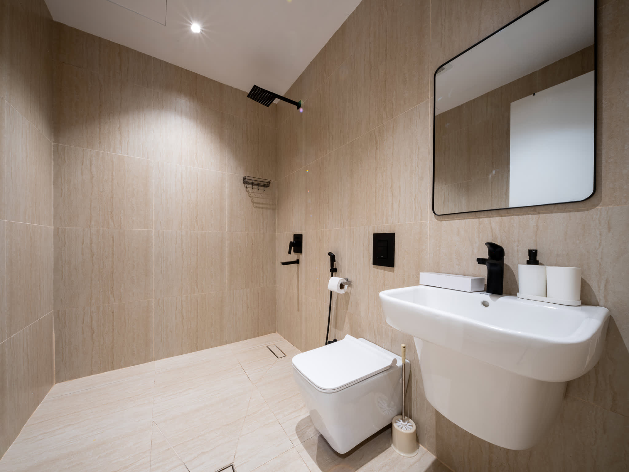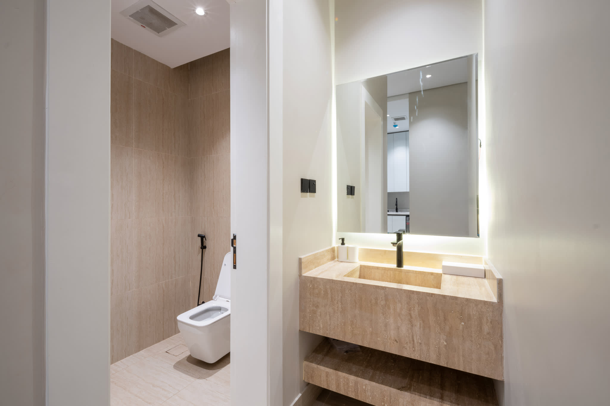 غرفة النوم الرئيسية (ماستر) مزودة بحمام خاص، بينما الغرفة الثانية بحمام مستقل، بالإضافة إلى دورة مياه للضيوف، مما يجعلها مناسبة للعائلات براحة تامة.